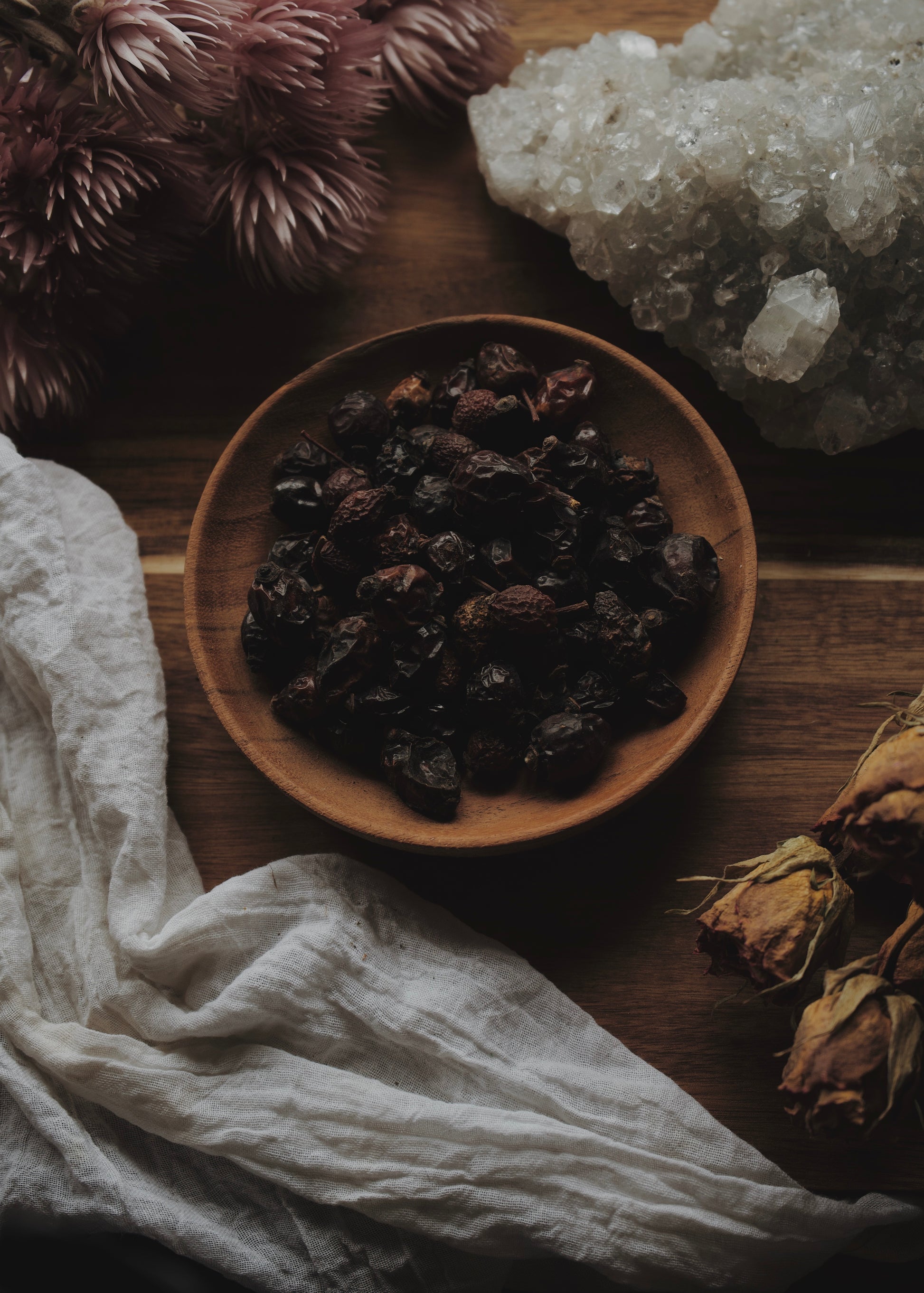 Rosehips symbolise gentle love and nurturing energy. Add to teas for warmth and comfort, or use in sachets to promote harmony and protection. Rosehips are often used in love spells, beauty rituals, and healing charms.