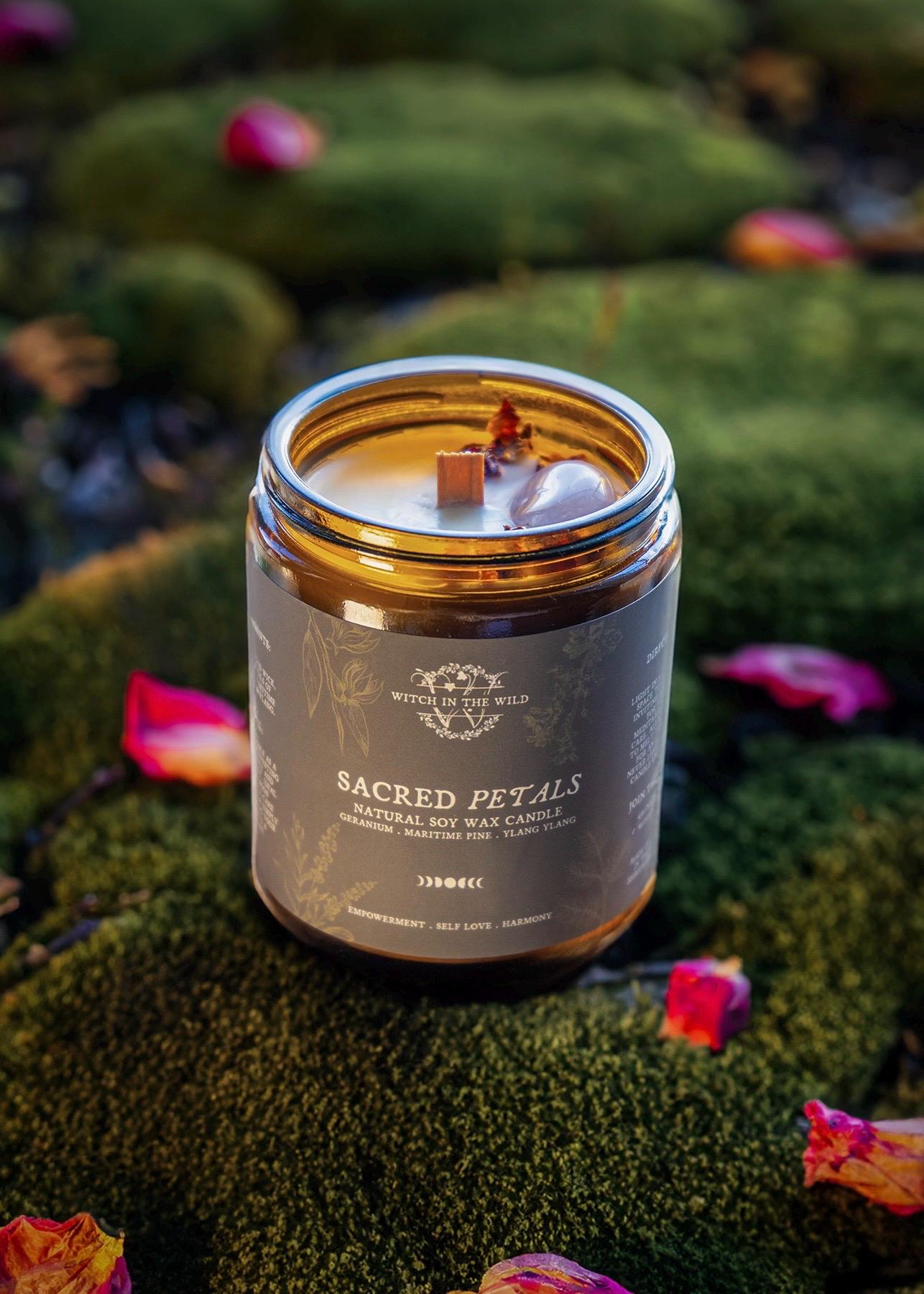 Each candle is topped with real rose petals for a touch of beauty and intention. As it burns, the gentle crackle of the wood wick enhances the experience, creating a grounding and meditative atmosphere.