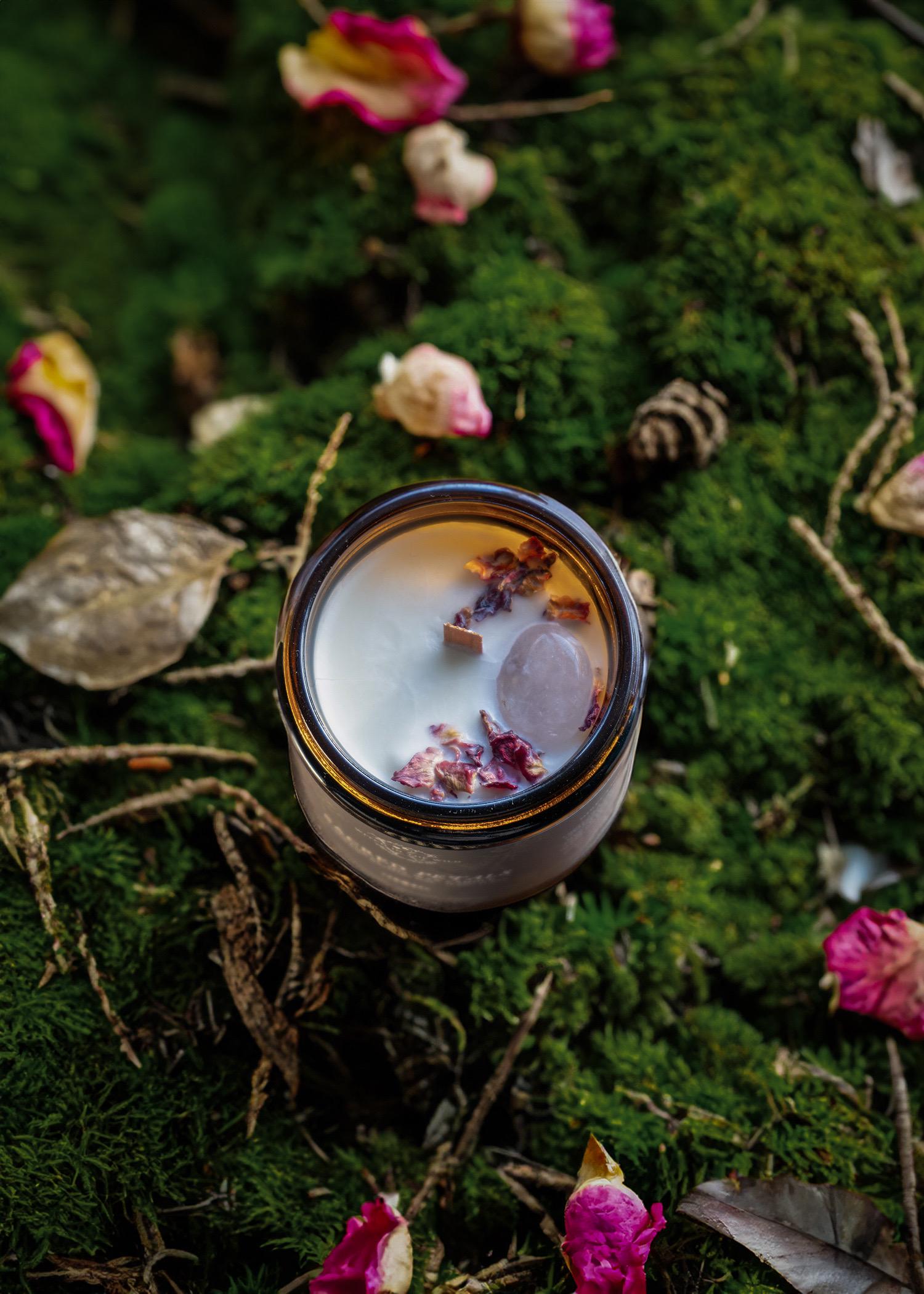 Infused with the energy of rose quartz, the stone of unconditional love and self-worth, this hand-poured soy wax candle is designed to help you cultivate empowerment, self-love, and harmony in your space.